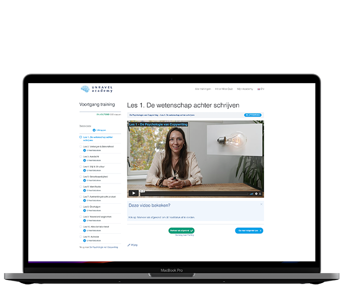 Een ware schatkist aan direct bruikbare kennis dus – en die houden we niet voor onszelf. Unravel Academy helpt je in sneltreinvaart de beïnvloedingstechnieken eigen te maken die voor jouw marketinggebied relevant zijn. Inzichten die je de rest van carrière zult blijven gebruiken.